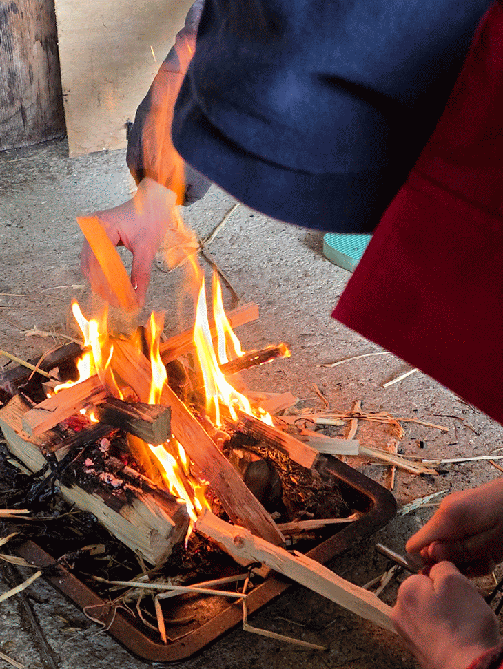 The challenges continued with a ‘no matches’ firelighting session. Using just a flint and steel and some fluffed up cotton wool we soon had our straw and kindling burning and within 5 minutes there were 4 healthy fires blazing in the barn area. All made by our young fireraisers.